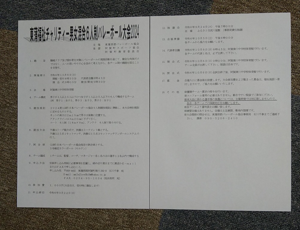 投稿日: 2024年8月28日 投稿者: shop-ikedaya.jpチャリティー大会 「東蒲福祉チャリティー男女混合6人制バレーボール大会2024」 「東蒲福祉チャリティー男女混合6人制バレーボール大会2024」が今年も10月6日に開催する事となりました。 今年で26回目となり昨年までの大会参加費や募金箱設置により総額約115万円を福祉施設に寄付しています。 今年も多くの人達が参加してくれるのを待っています。 是非参加してバレーボールを楽しみませんか?
